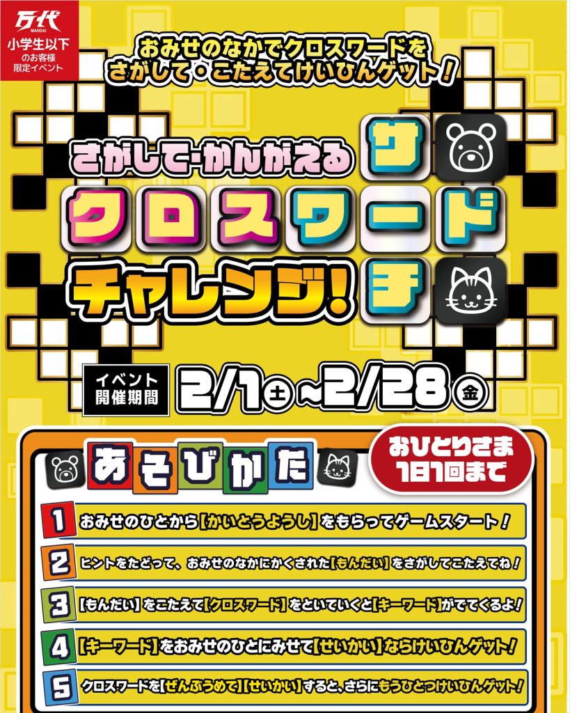 2月も注目のイベント盛りだくさん!! 【2/1~2/28まで連日開催】 ↓ クロスワードチャレンジ ↓