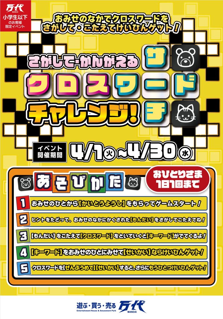 4/1~4/30 まで連日開催 【クロスワードチャレンジ】 探して考えて景品ゲット!!↓ 【今週のイベントはこちら】 ↓