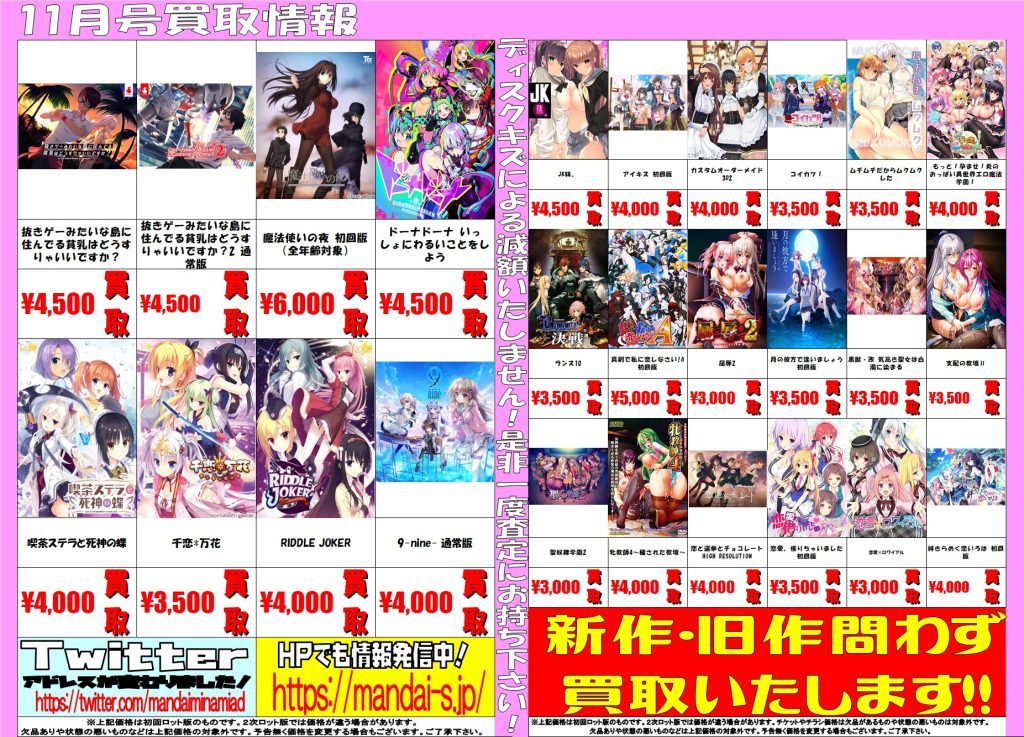 萌え〈アダルト〉10/17 新作美少女PCゲームの買取告知です!